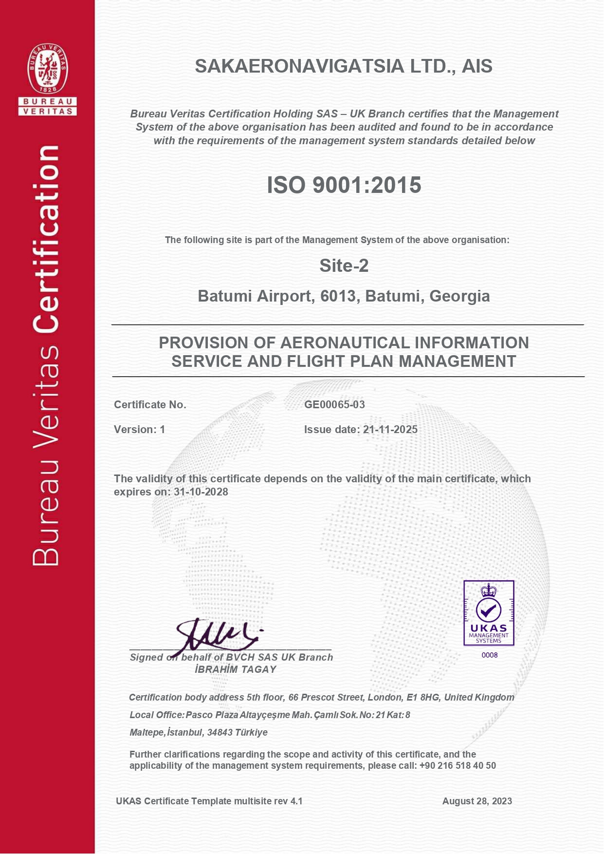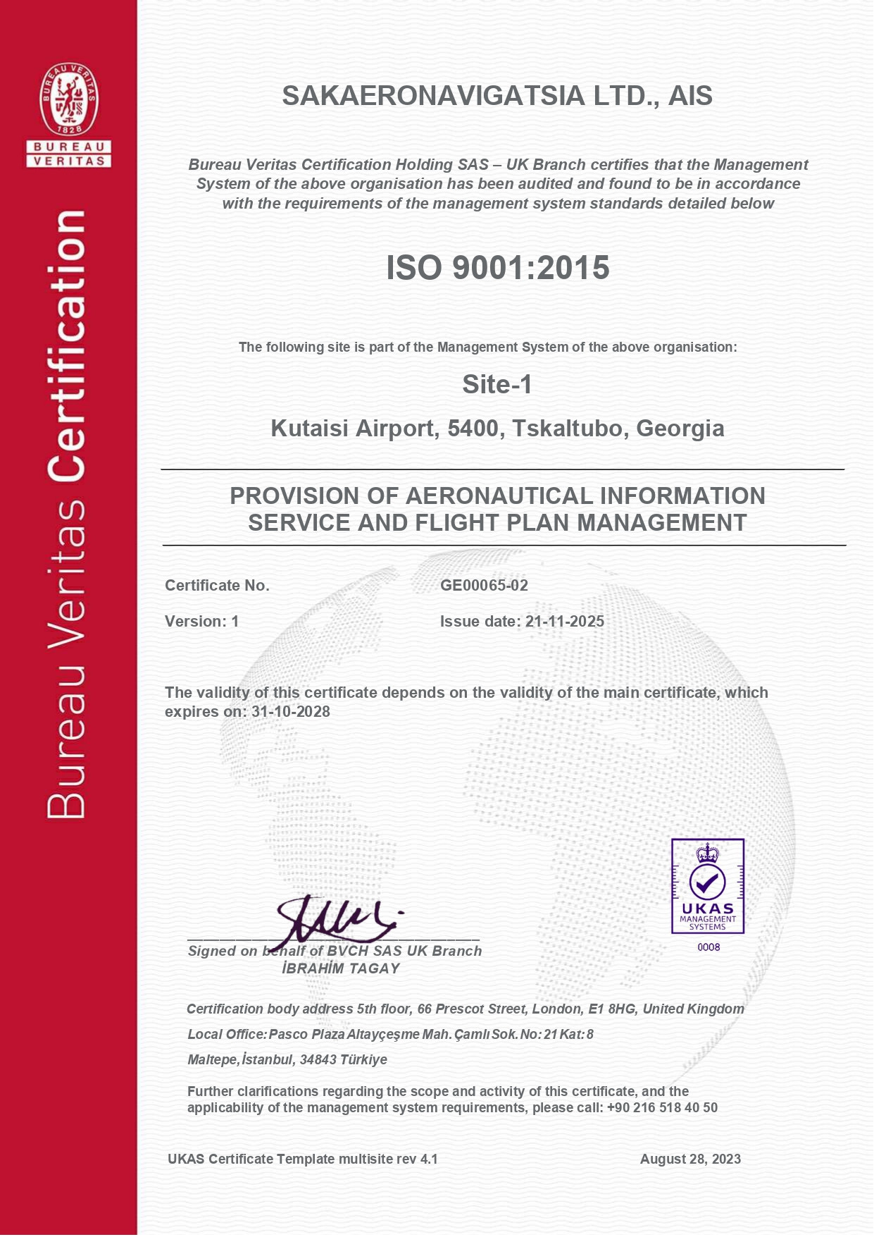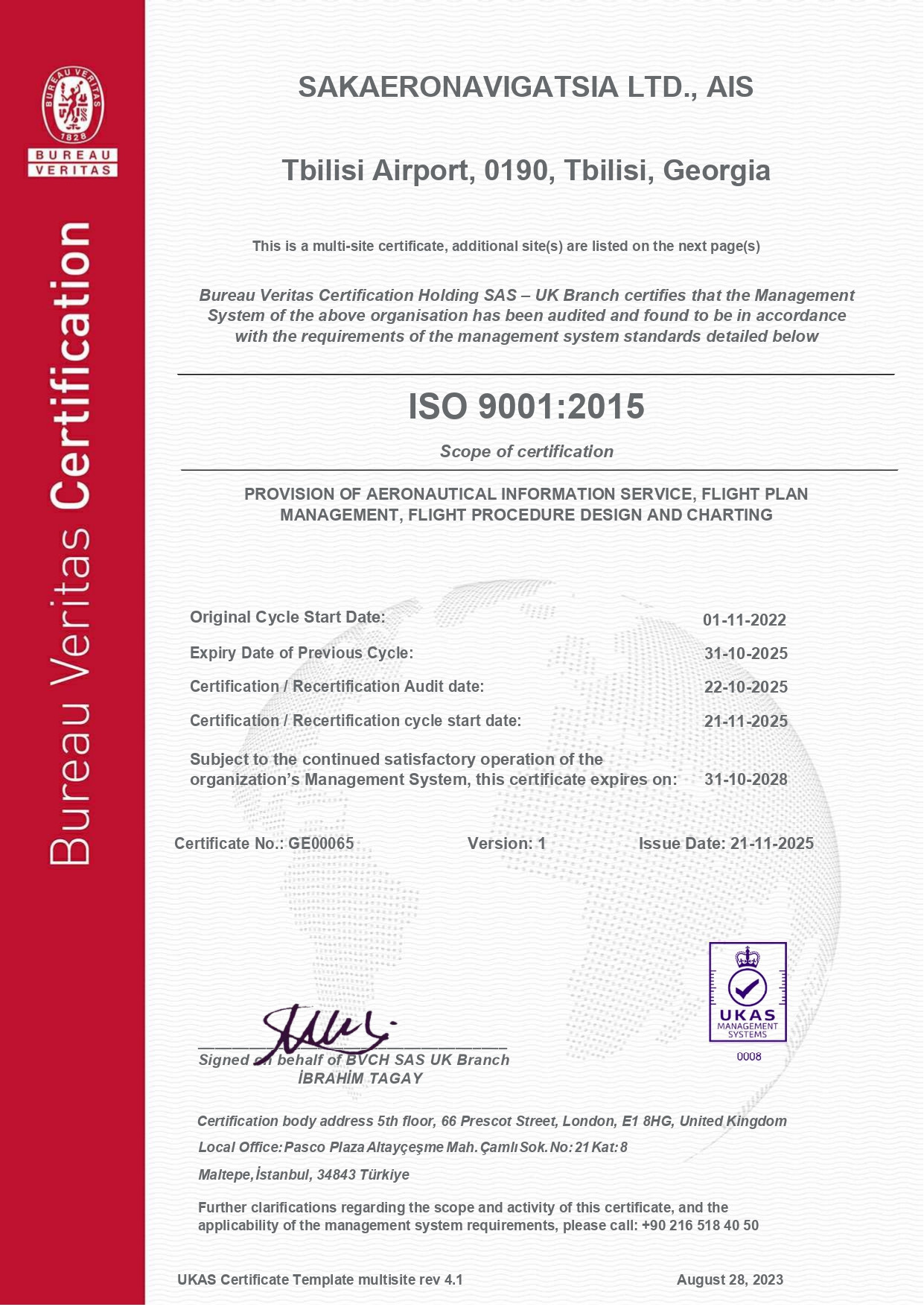 ISO 9001:2015 სტანდარტის მოთხოვნებთან შესაბამისობის სერტიფიკატის შესანარჩუნებლად სააერნაოსნო ინფორმაციის სამსახურში ყოველწლიურად ტარდება საზედამხედველო/სარესერტიფიკაციო აუდიტი.